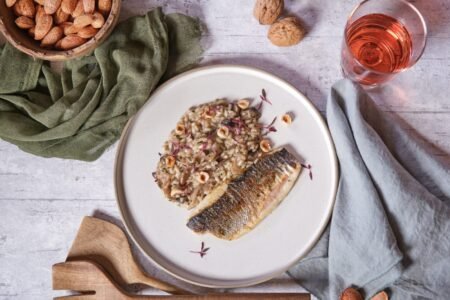 Christmas Fasting Main-Course Pan Pot Sautéed Sea Bass served with Mushroom Risotto flavoured with Black Truffle Oil and Hazelnuts