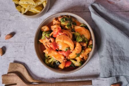 Christmas Fasting Main-Course Pan Pot Cuttlefish in Tomato with Collard Greens and Broccoli served with French fries