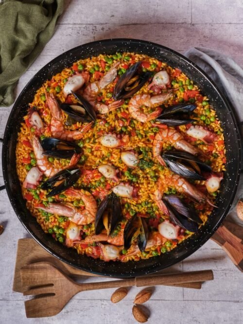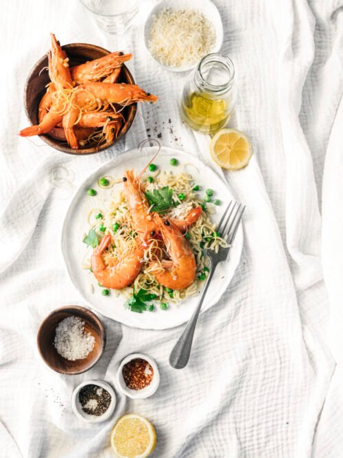 Visit a Blue Island Fish Market for your cleaned Prawns Prepare all the ingredients: 1. Fry the ingredients 2. Add the orzo and all the liquids 3. Cover for 15 minutes 4. Serve Met