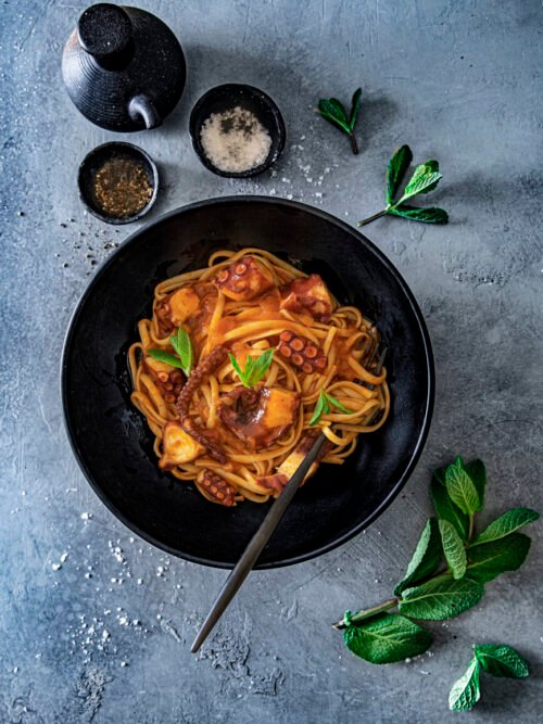 Visit a Blue Island Fish Market for your cleaned octopus Prepare all the ingredients: 1. Cook the octopus 2. Boil the linguine 3. Serve Method Rinse the octopus well and plac