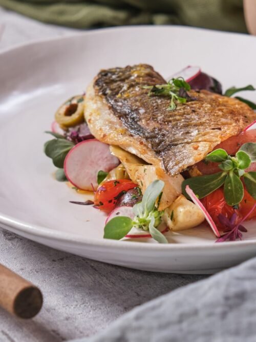 Sea Bream Fillet with Artichokes, Cherry Tomatoes and Green Olives served with Baby Potatoes