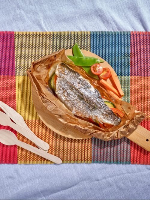 Visit a Blue Island Fish Market for your fresh Sea Bream fillets Prepare all the ingredients: 1. Place the vegetables on the baking paper 2. Add the rest of the ingredients 3. Add