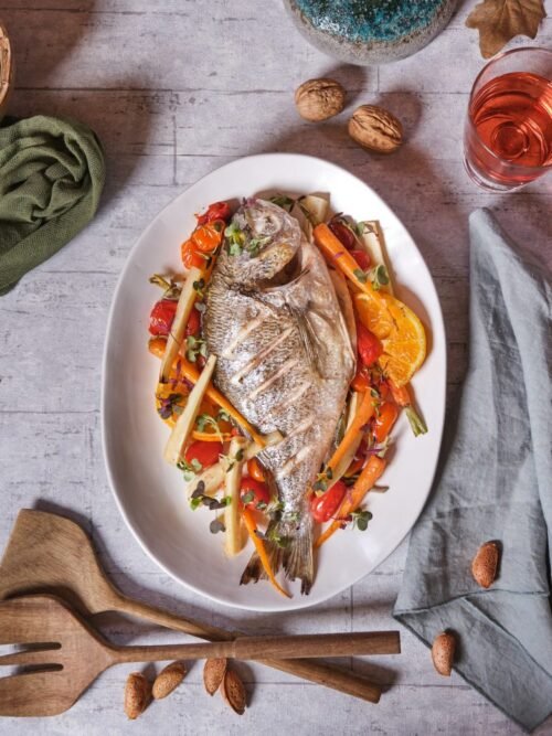 Baked Sea Bream marinated with Sage and Orange served with Parsnips, Cherry Tomatoes and Baby Carrots