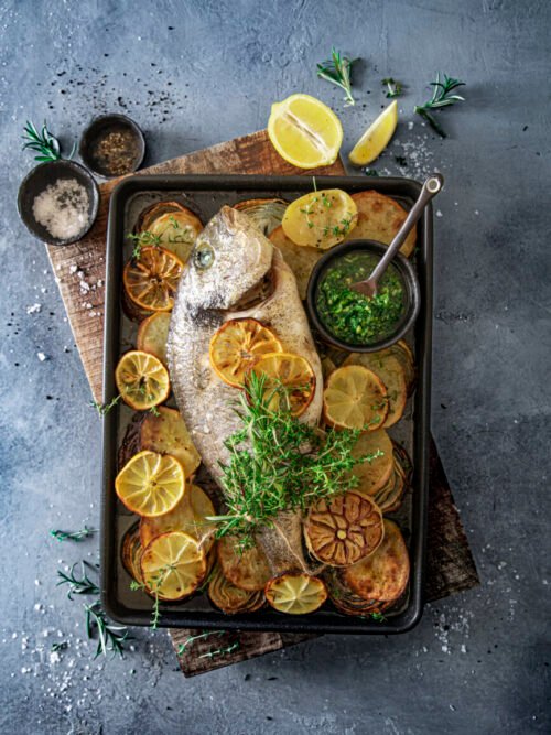 Visit a fresh Blue Island Fish Market for your fresh cleaned Sea Breams Prepare the ingredients: 1. Marinate the sea breams 2. Bake the potatoes 3. Bake the sea breams 4. Prepa