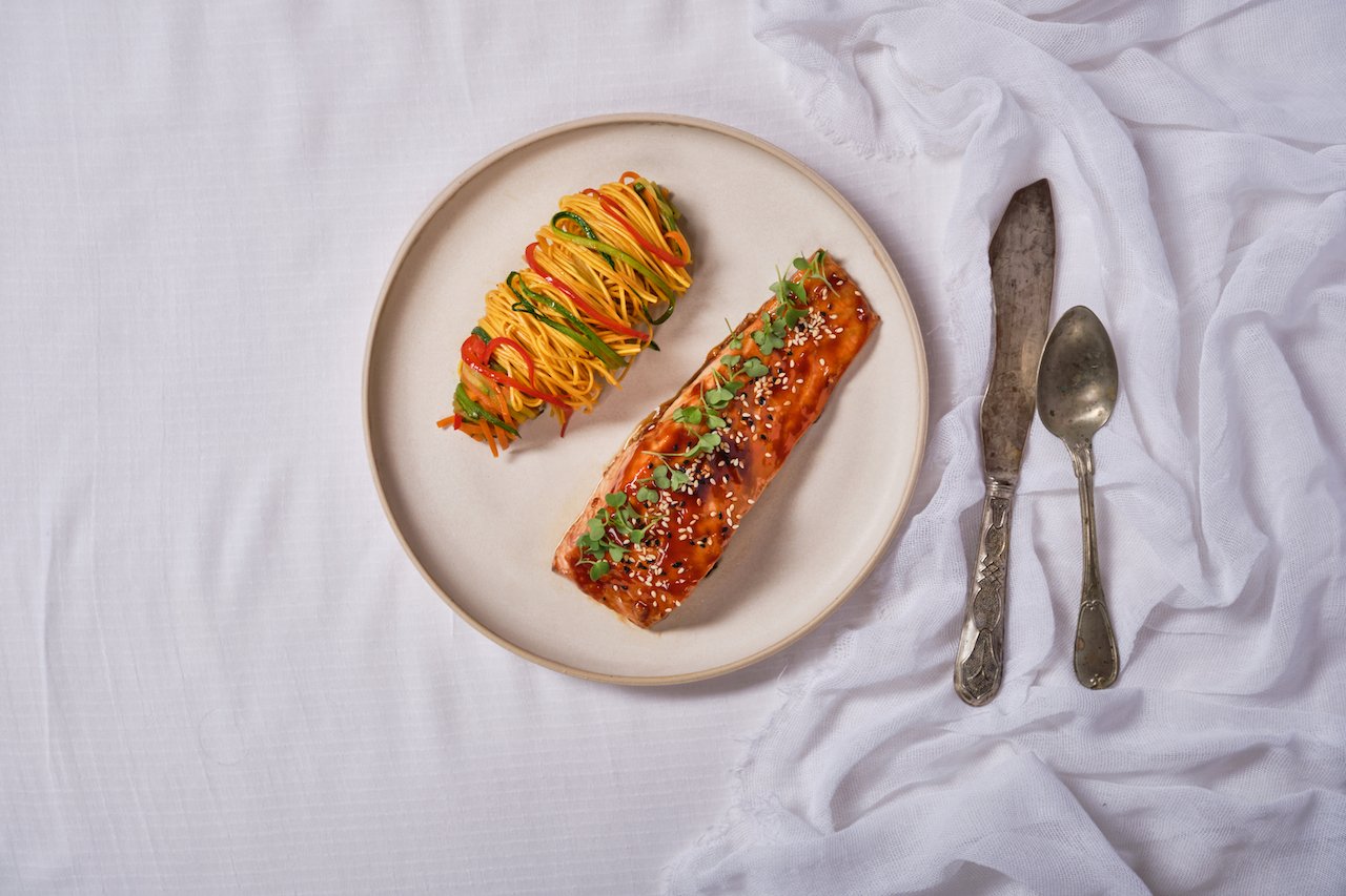 Put the salmon fillets in a baking dish and marinate them with the soy sauce, Mirin, garlic, ginger and then stir. Bake in a pre-heated oven at 180˚C for 15 minutes. At the same time, boil some water in a saucepan and add the noodles. Cook for two minutes. Put the sesame oil in a frying pan and fry the salted vegetables until they are soft. Add the noodles and Hoisin sauce and stir. Then remove from the heat and serve with the salmon fillets.