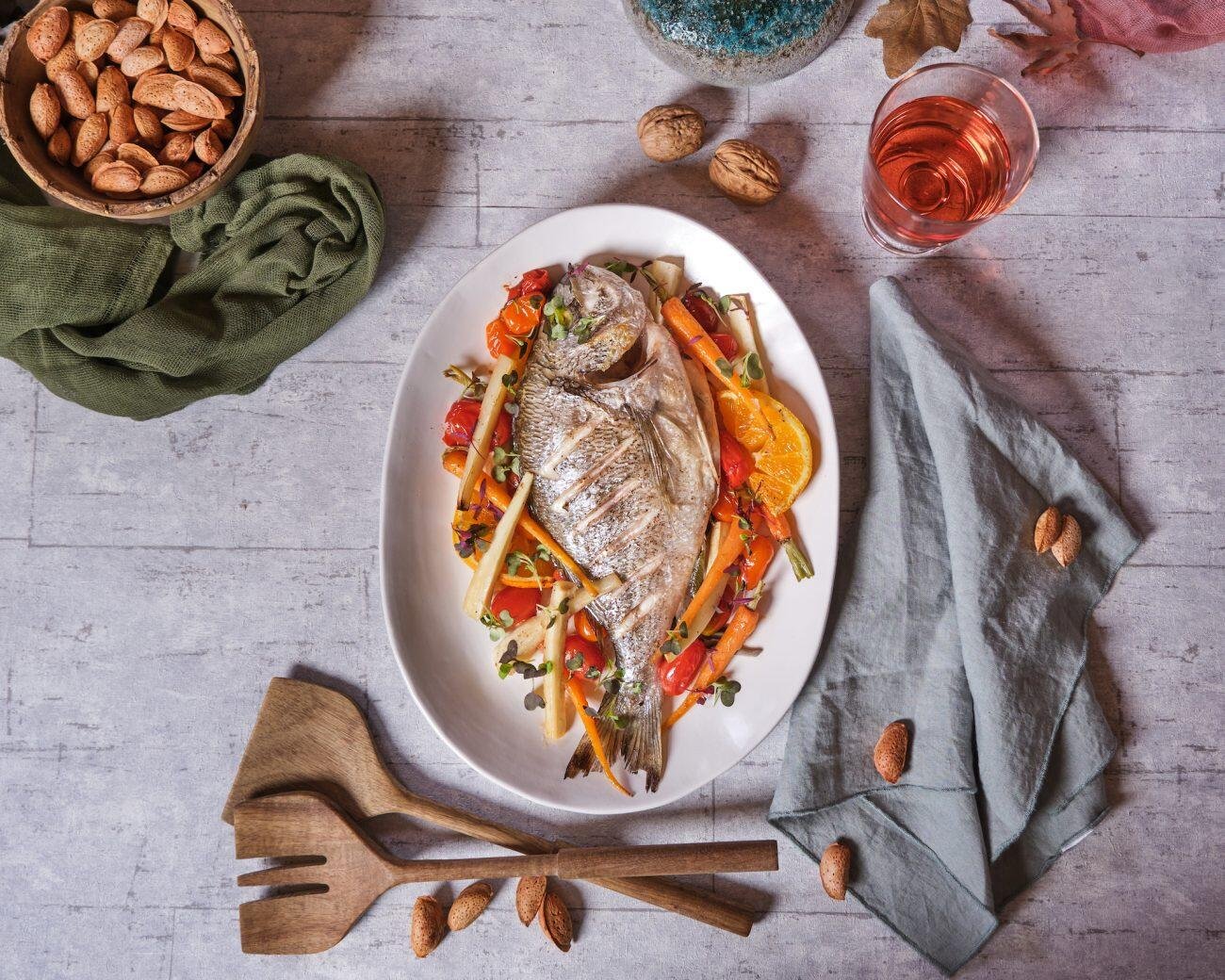 Baked Sea Bream marinated with Sage and Orange served with Parsnips, Cherry Tomatoes and Baby Carrots