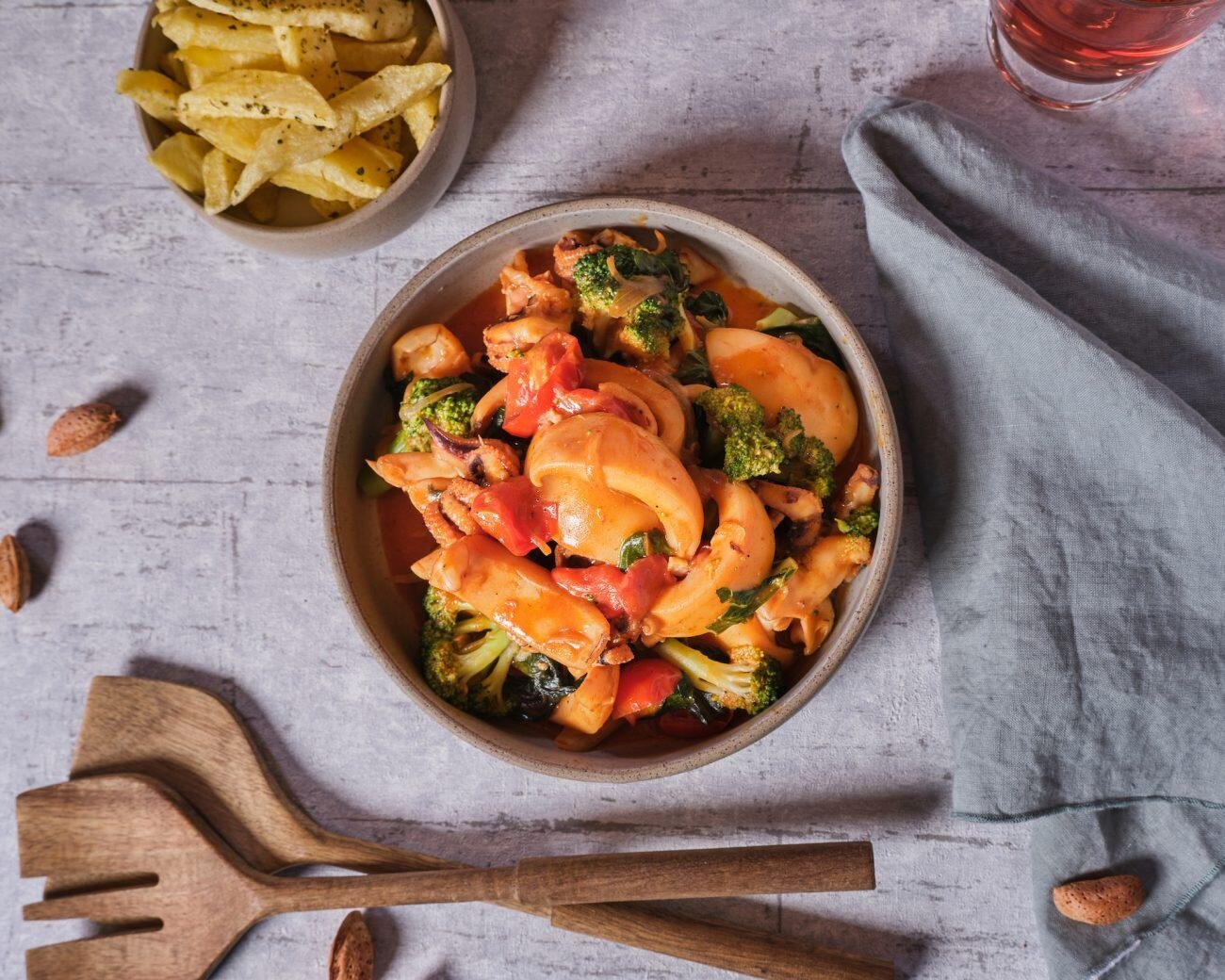 Cuttlefish in Tomato with Collard Greens and Broccoli served with French fries