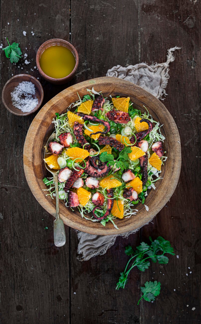 Peel the orange and separate it into wedges. Remove the membranes and cut the wedges into pieces. Place the cabbage, coriander, and spring onions into a salad bowl. Add the orange and the octopus. For the dressing, mix the ingredients in a jar with a lid or a small blender until combined. Pour the dressing over the salad and serve.