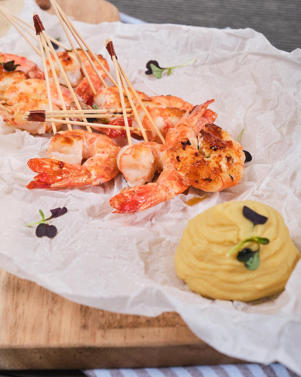 Skewer the prawns onto sticks and serve with the yellow lentil puree.