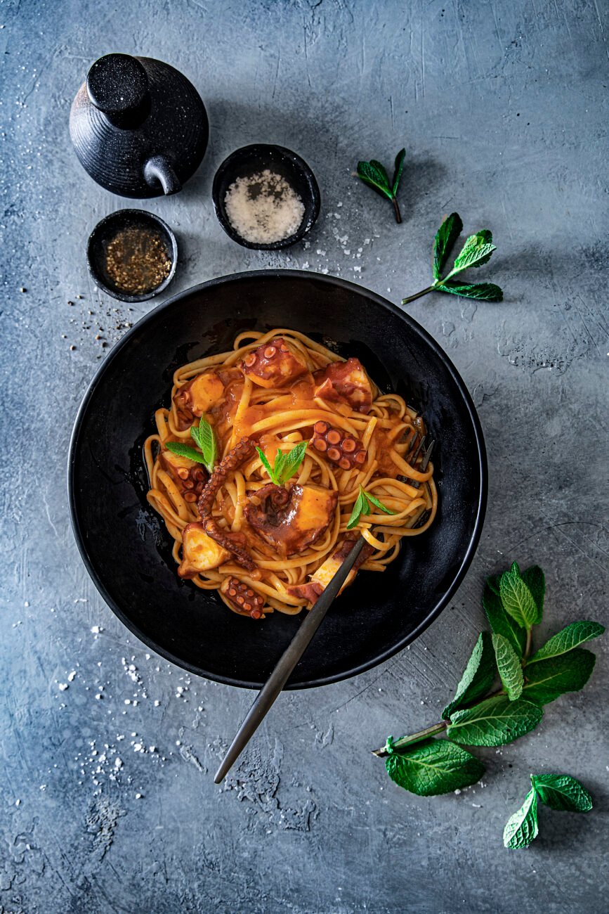 Pour plenty of water into a pot and place it over high heat until it comes to a boil. Then, add the salt and bouillon cube and stir. Place the pasta into the pot and when the water comes to a boil again, lower the heat to medium and boil for 10 minutes. Stir occasionally so that the pasta does not stick. When it is ready, drain it, keeping one cup of its broth. Return the pasta to its pot and add the octopus. Stir and serve. If desired, garnish the dish with basil, mint, or parsley leaves.