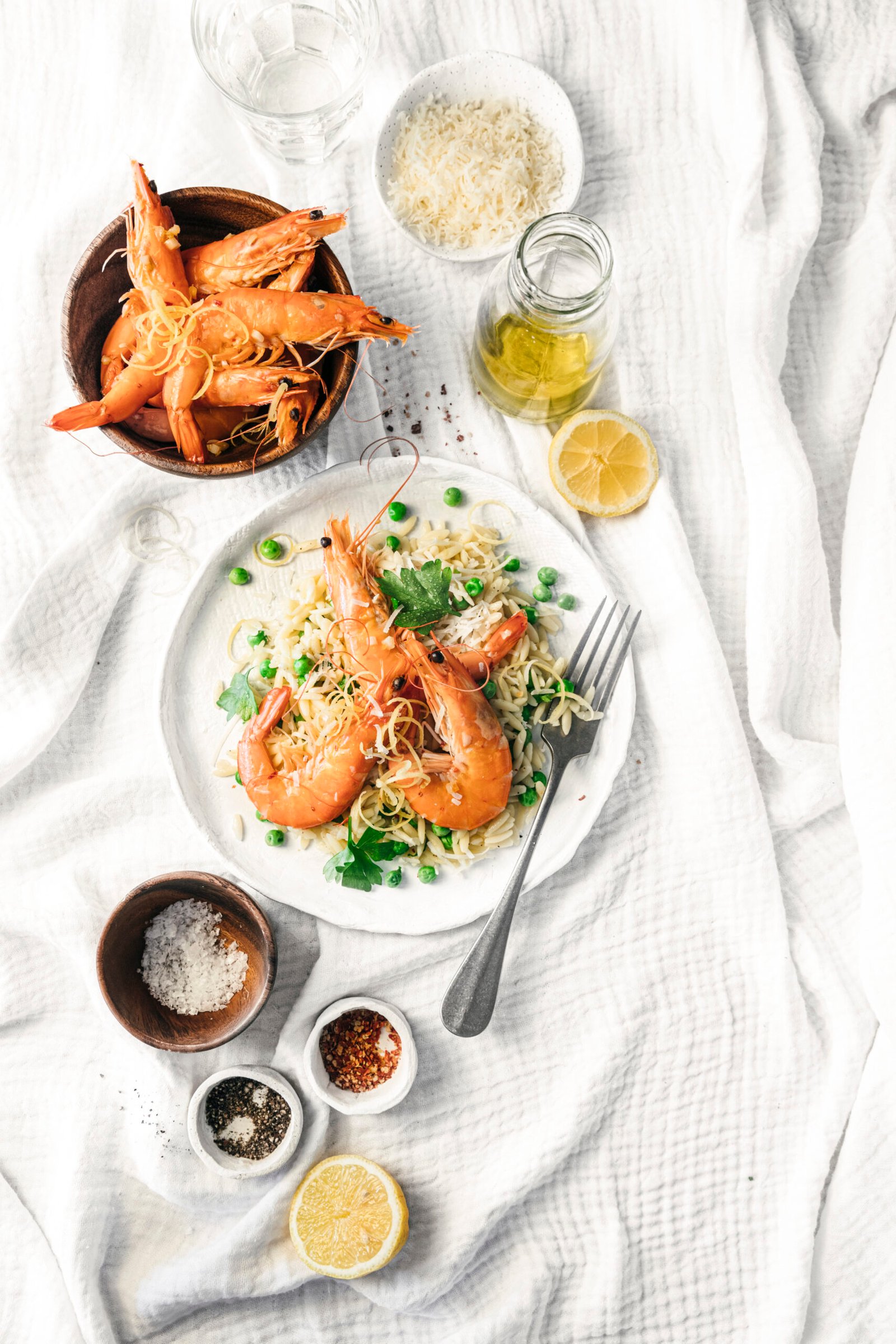 Carefully add the prawns with the sprig of rosemary and cook for a few minutes until they turn red. Remove the rosemary. Add the orzo and mix slightly for 2 minutes. Next add the grated tomatoes, salt, fresh pepper and mix carefully.