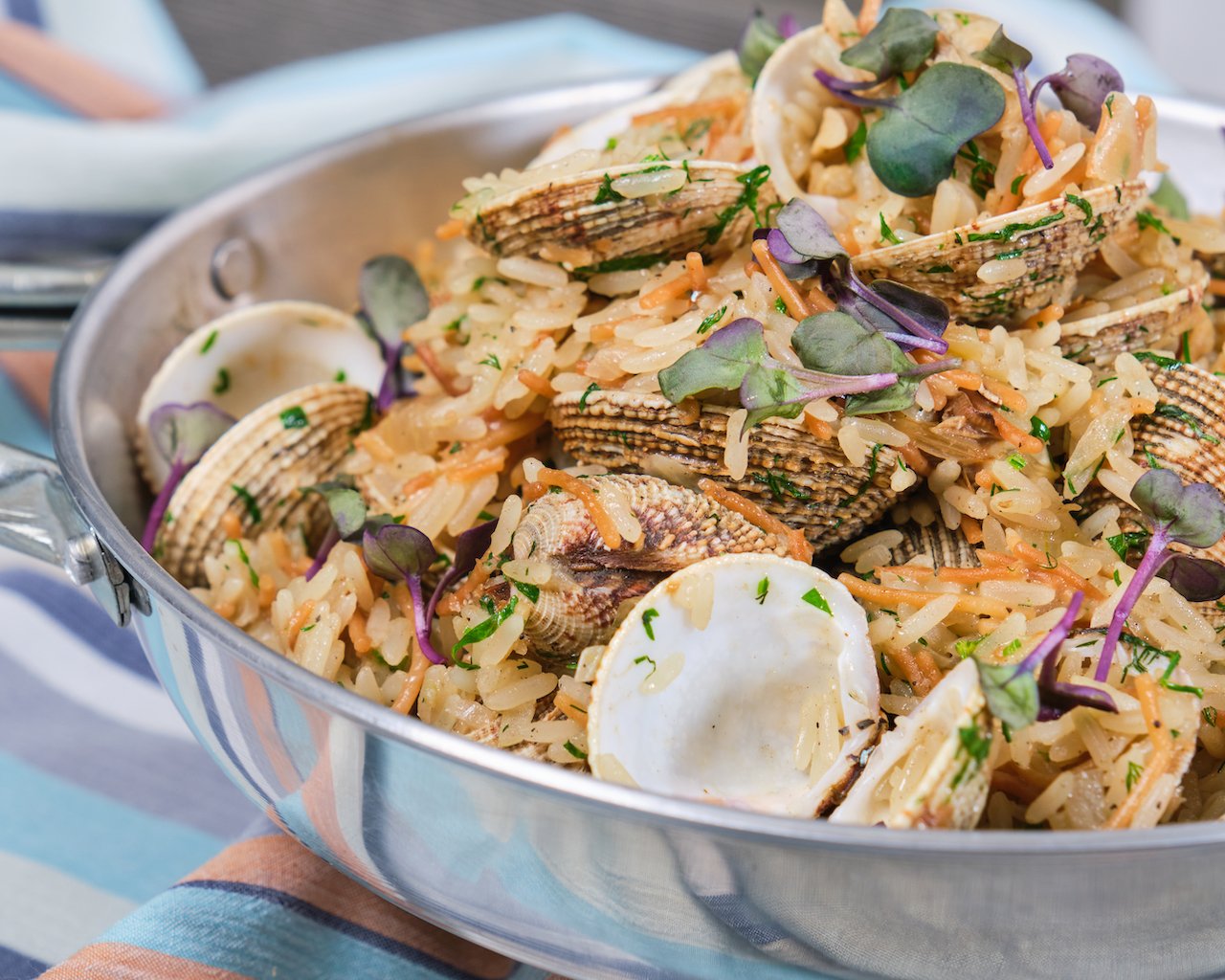 Rince the cockles well under cold running water. Place a saucepan over medium-high heat and add the olive oil to heat. Add the vermicelli and the onion. Cook until the onion softens and the vermicelli lightly browns. Add the cockles and mix. Deglaze with the wine and cover the pot for 2-3 minutes. Discard any cockles that haven’t opened after cooking.