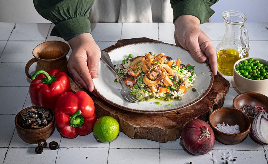 Mix the rice, calamari, red bell pepper, capers, parsley, red onion, black olives, sun-dried tomatoes, boiled peas, sweet paprika, 1 teaspoon of salt, black pepper, olive oil, zest, and juice from the lime, in a large bowl. Mix well and serve.