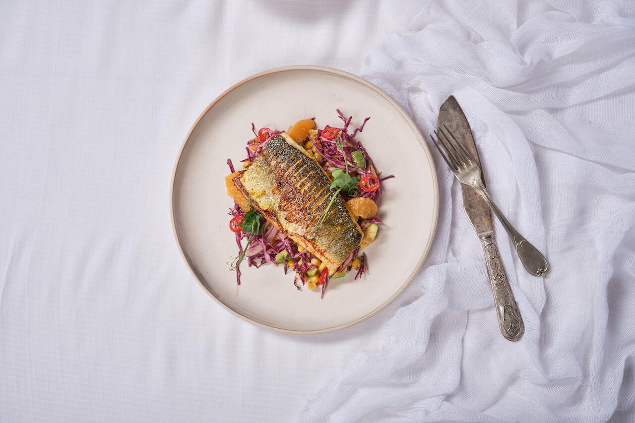 Sautéed Sea Bass with Sweetcorn, Avocado, Red Cabbage and Orange Salad