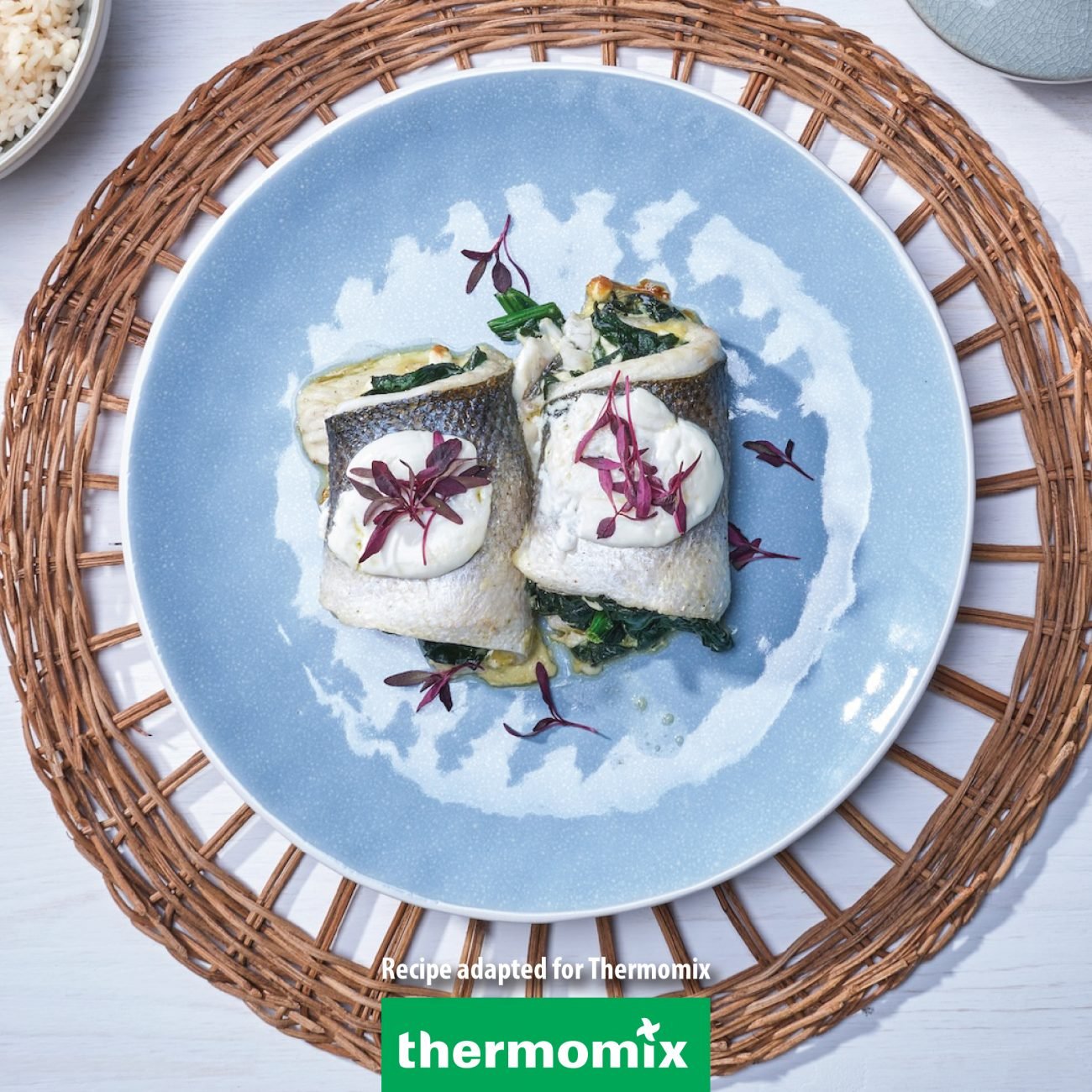 7. Remove Varoma and simmering basket and set aside. Transfer rice into a with a deep dish, the sea bass rolls on a lined plate and serve immediately.