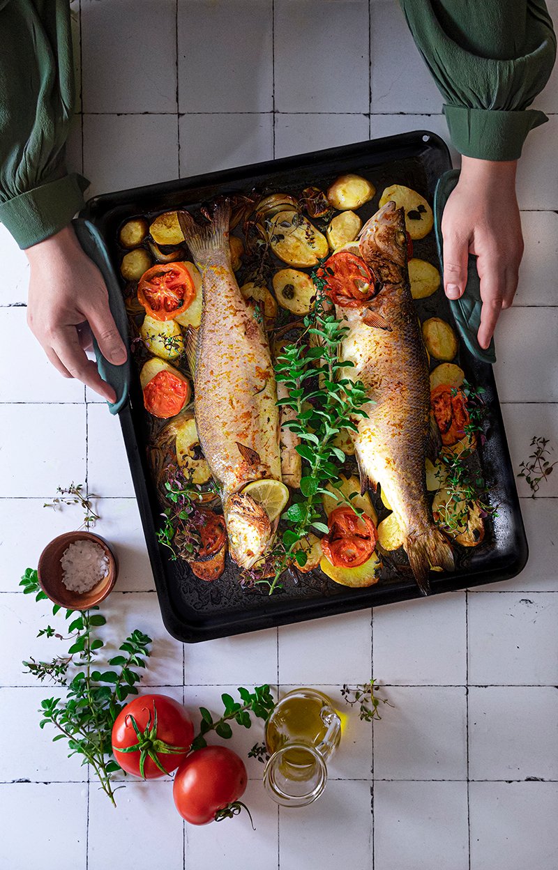 Serve by pouring the juices from the baking tray over the fish.
