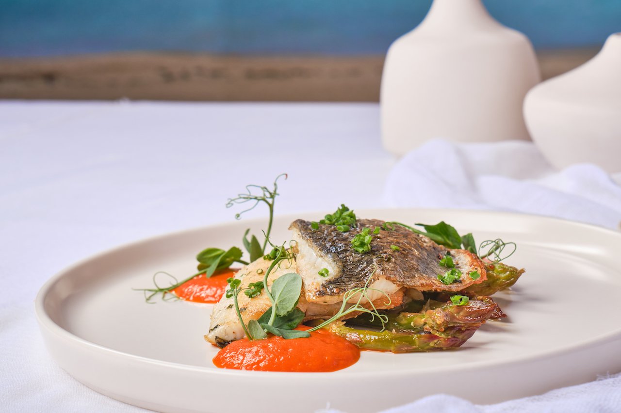 Serve by putting the asparagus on a plate with the bream fillets on top. Garnish with the red pepper purée and the sauce.