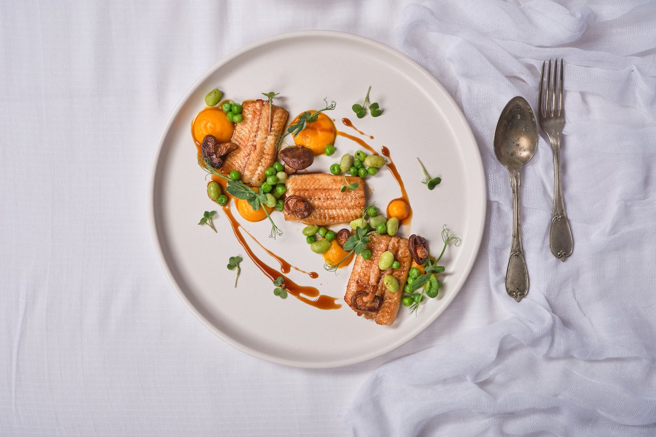 Then put the sesame oil in another frying pan and fry the mushrooms for two minutes. Add 2 – 3 tablespoons of the Unagi sauce and cook for another minute until they are glazed. Serve the fillets on a plate with the vegetables, carrot purée and sauce.