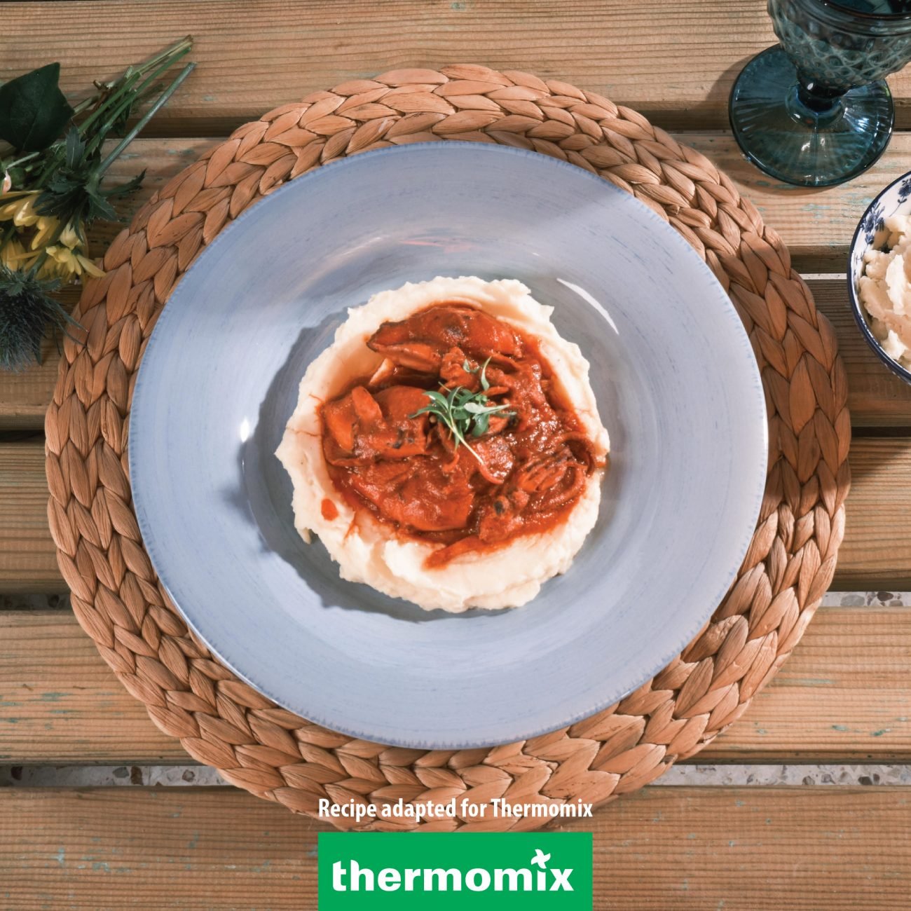 - Remove Varoma and set aside. Transfer squid with their sauce carefully, so as blade cover doesn’t fall, to a thermo server and set aside. Remove blade cover and rinse mixing bowl.