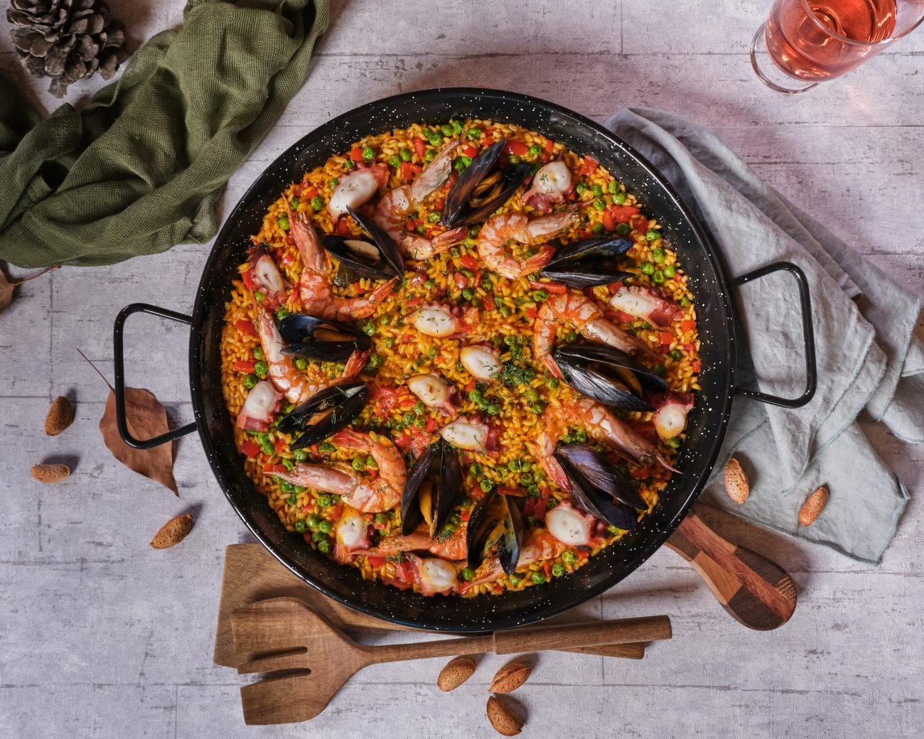 Then sauté the onion and garlic in olive oil, using a broad frying pan until they are soft. Then add the rice, saffron, paprika, salt and pepper, bay leaves, tomatoes, sweet pepper and cook for 2 minutes. Add the wine and fish stock in 2 portions. Finally, add the peas.
